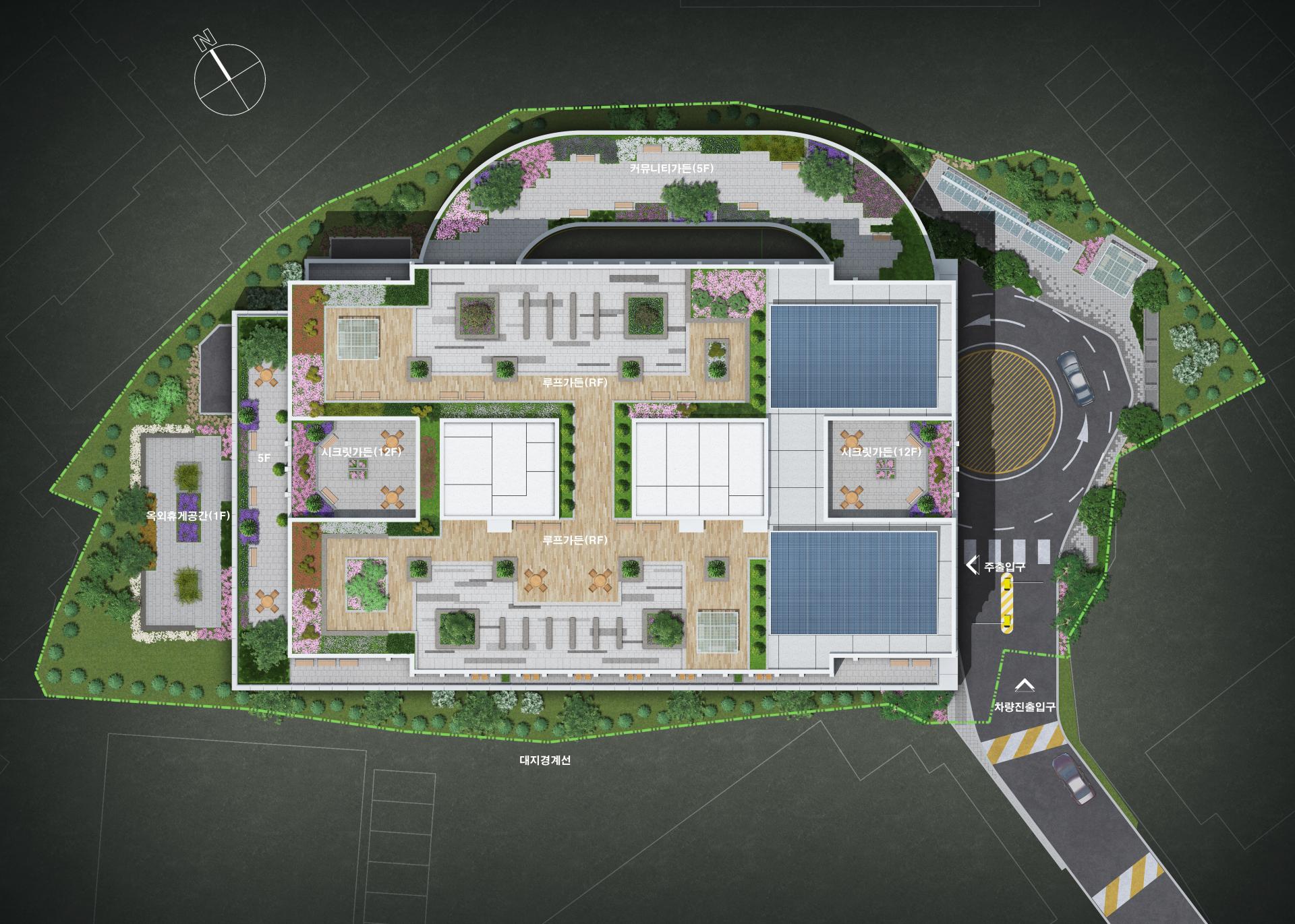 단지의 3~4층은 생산성을 최대한 고려한 최적의 드라이브인 시스템을 갖췄습니다. 또한 법정 주차대수 대비 약 200%에 달하는 157대의 주차공간을 확보했습니다.