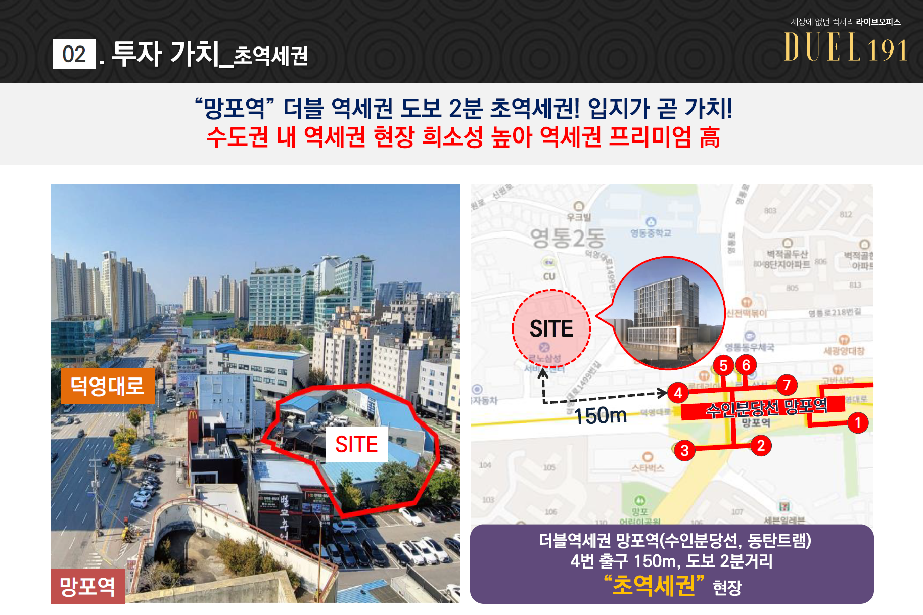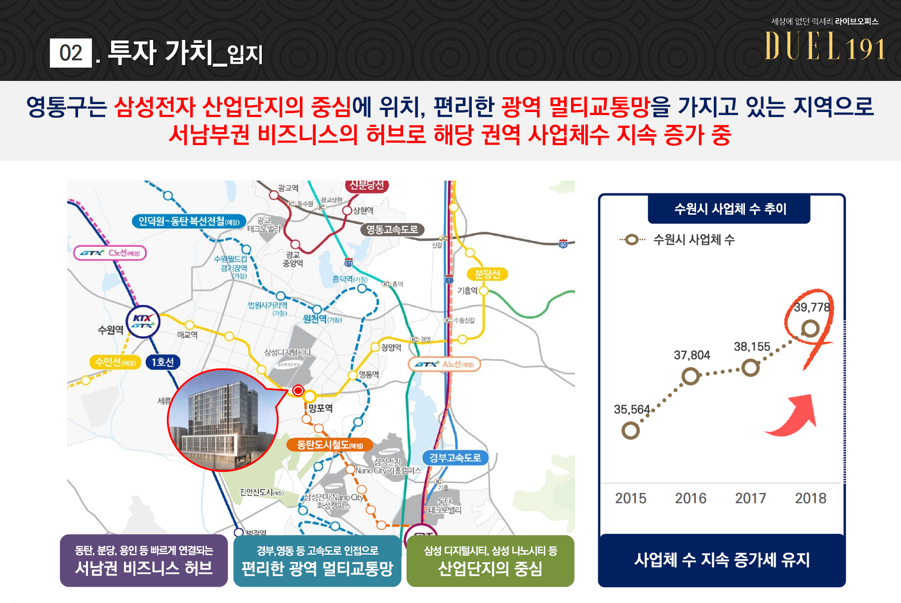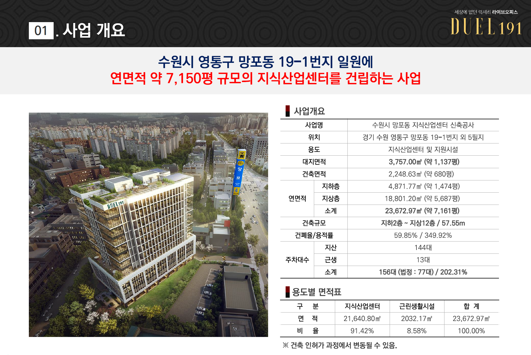 이런 가운데 수원시 영통구 망포역 주변에 지식산업센터 ‘두산 듀엘 나인틴원(DUEL 191)’가 망포동 일원에 공급됩니다.