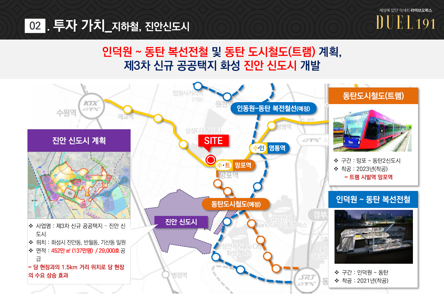 단지는 주변에 망포역이 있으며, 망포역 지하철을 이용해 판교와 강남권까지 빠르게 이동이 가능합니다. 2027년(예정) 오산시와 동탄신도시, 수원을 잇는 동탄 트램이 개통하면 수도권 서남부권은 물론 강남, 분당, 동탄 등 업무지구로의 이동은 더욱 편리해질 전망입니다.