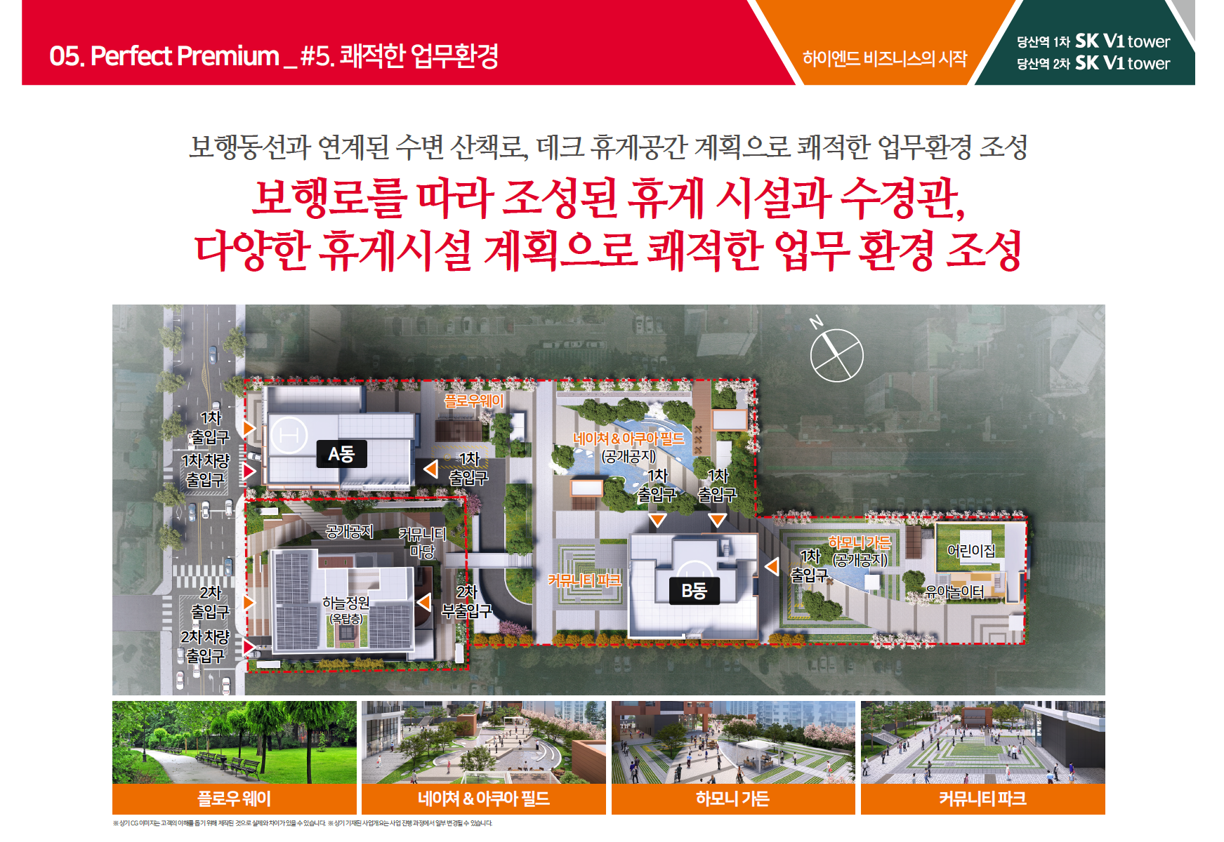 무엇보다 각종 특화설계가 적용돼 쾌적한 근무환경으로 조성될 계획입니다. 우선 당산역 1차 SK V1 tower는 넓은 연면적과 비례해 단지 곳곳에 플로우웨이(산책로), 커뮤니티파크(휴게공간), 네이처&아쿠아필드(수변 휴게광장), 하모니가든(열린 휴게공간), 한강뷰 스카이라운지 등 기존 업무시설에서는 보기 드문 트렌디한 커뮤니티 시설을 마련했습니다.