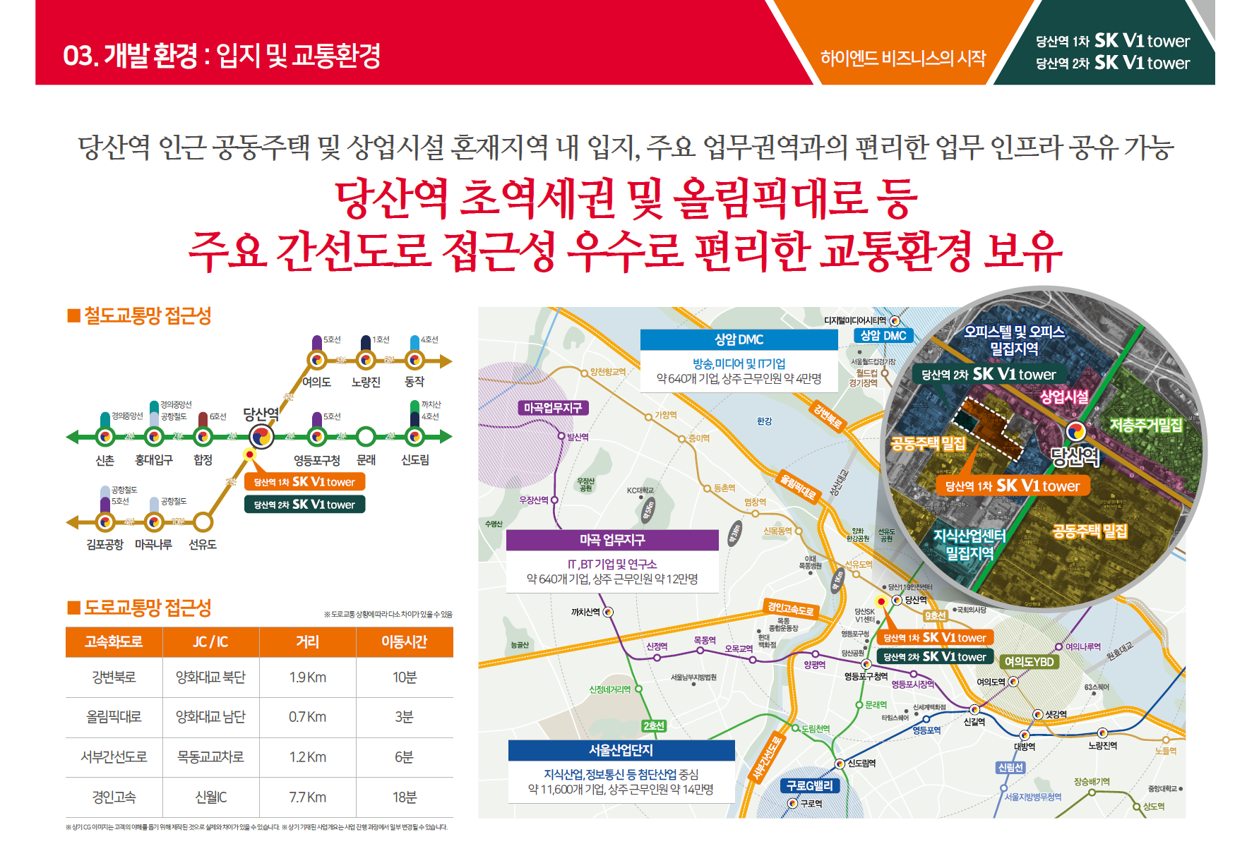 당산역 1차 SK V1 타워는 지하 5층~지상 35층(옥탑포함), 연면적 약 83,954.64㎡ 규모로 지식산업센터 558실, 지식산업센터(창고) 72실, 근린생활시설 17실, 기숙사 28실 등으로 구성됩니다.