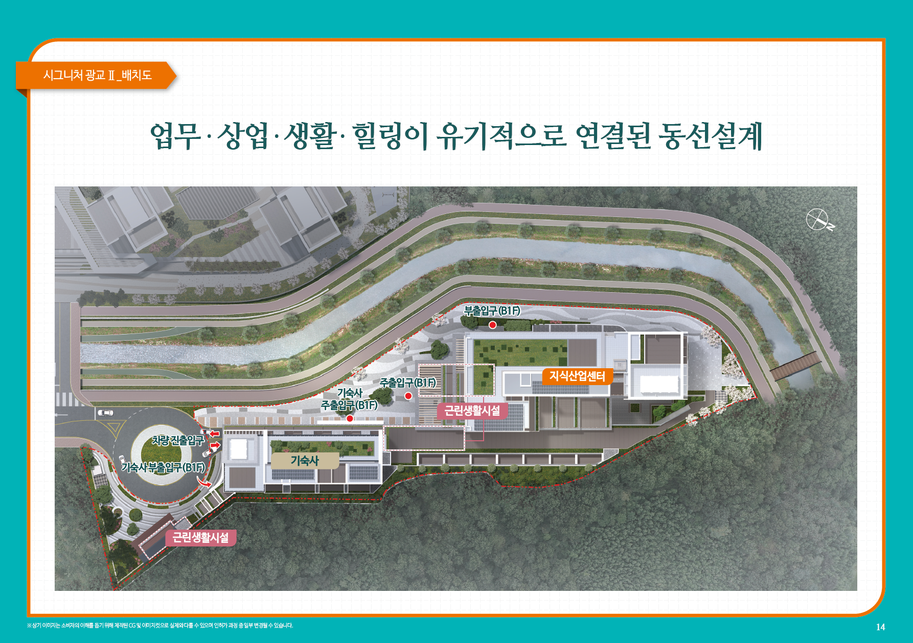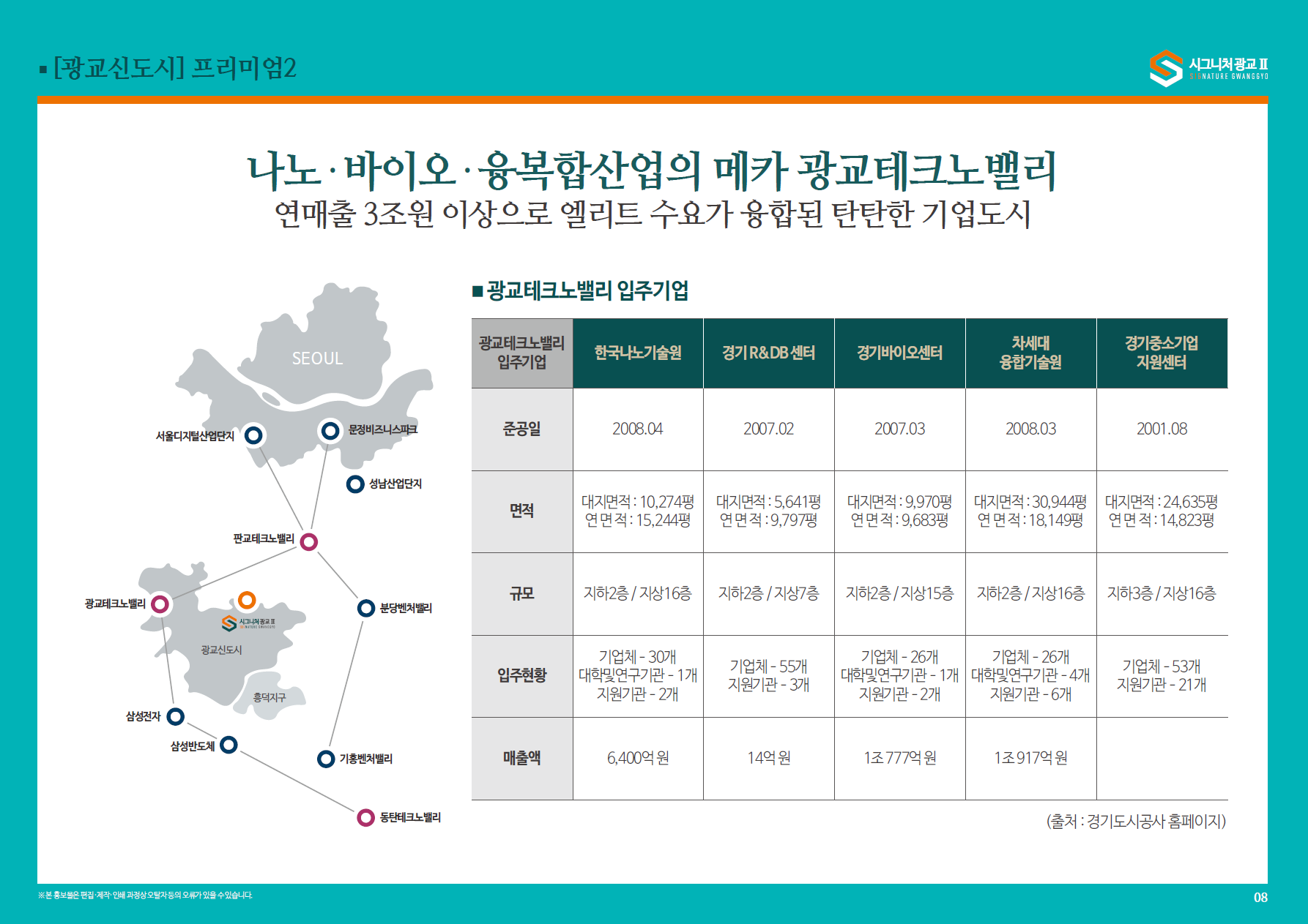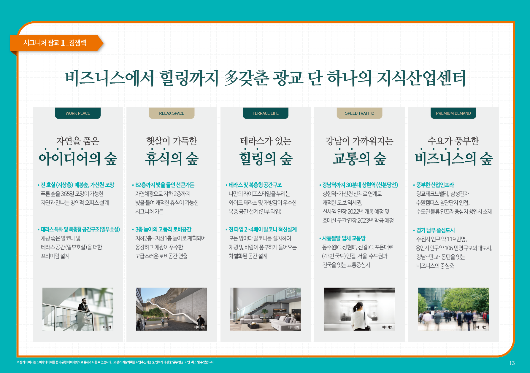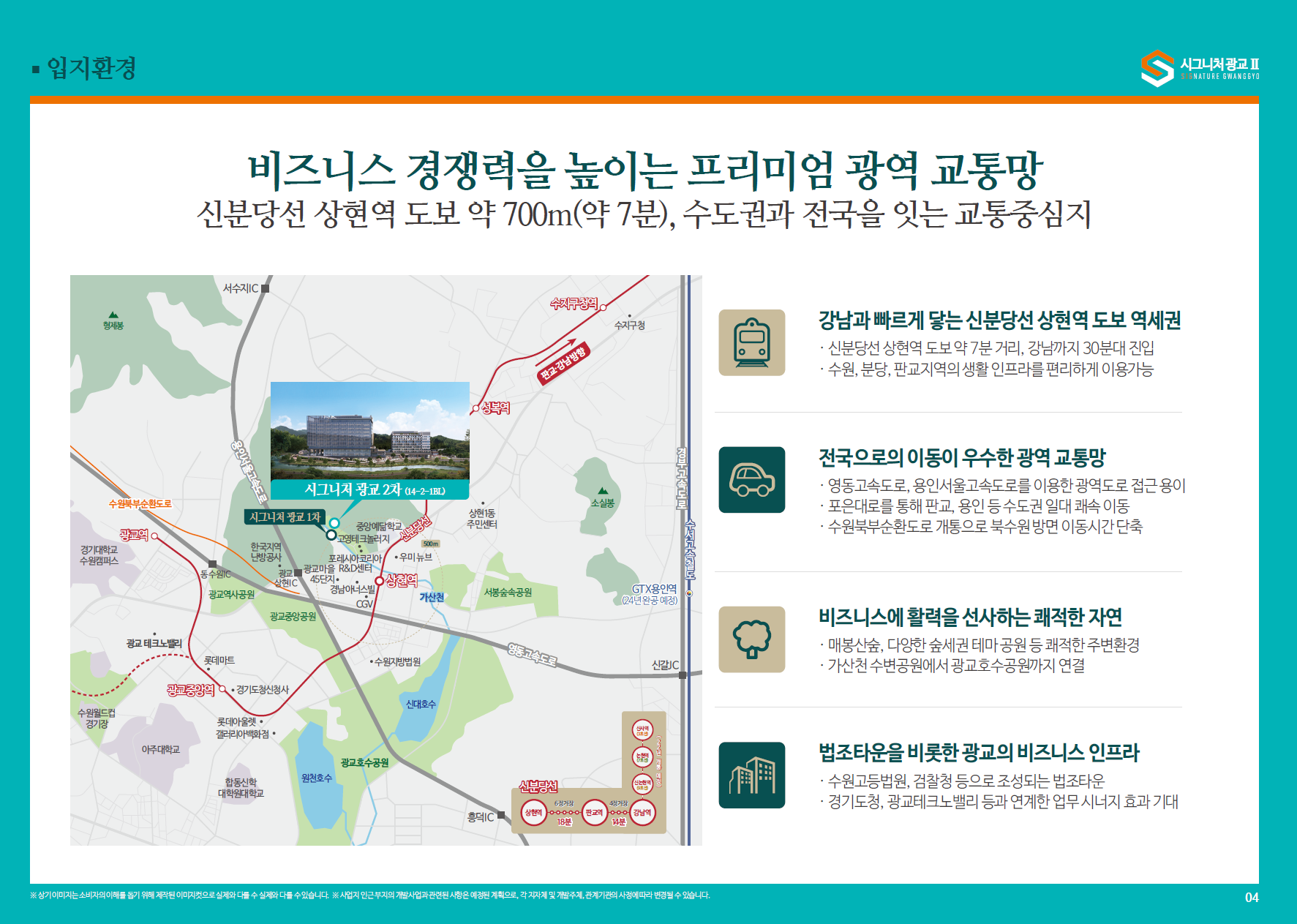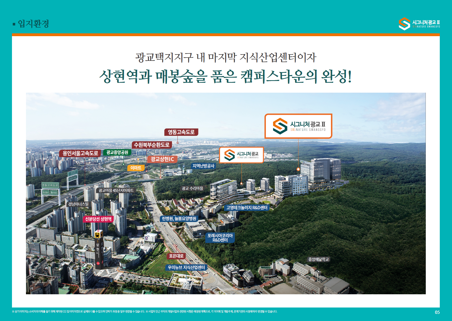 단지 부지 바로 옆에는 용인 상현4지구 도시개발사업 부지가 연면적 약 3만1000평 규모로 예정돼 있다. 매봉숲과 가산천 등 인근으로 녹지환경을 갖추고 있고, 주변으로 광교호수공원, 광교중앙공원 등도 있다. 업무효율성을 높이기 위해 내부 특화설계를 도입했으며, 기숙사와 커뮤니티시설이 조성됩니다.