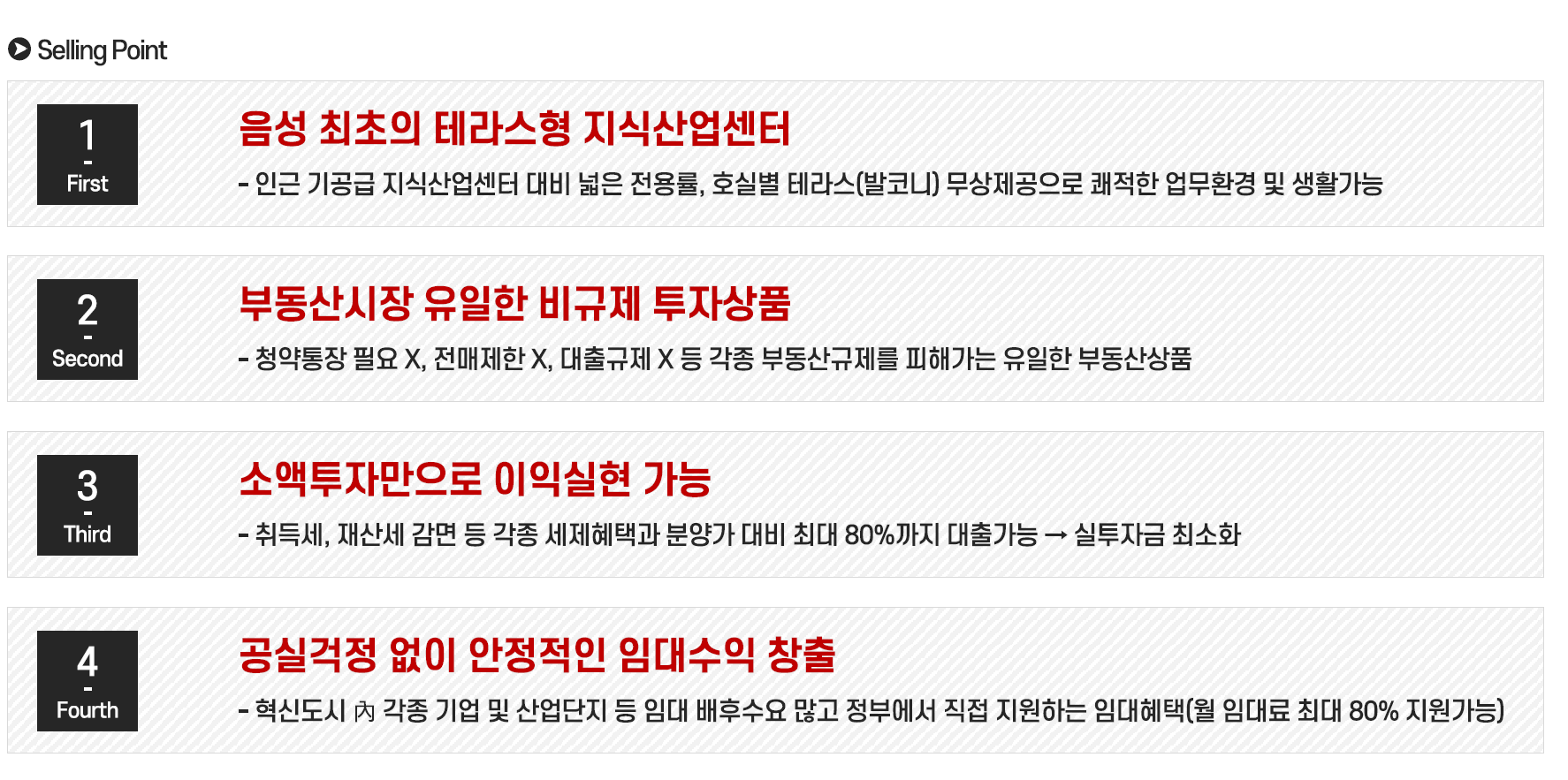 스타플렉스는 음성IC, 평택제천 고속도로와 대규모 산업단지 인접하고 있으며, 국립소방병원 및 약 11개의 공공기관 입주로 혁신도시의 지역개발 호재로 인한 풍부한 배우 수요가 있을것으로 전망됩니다.